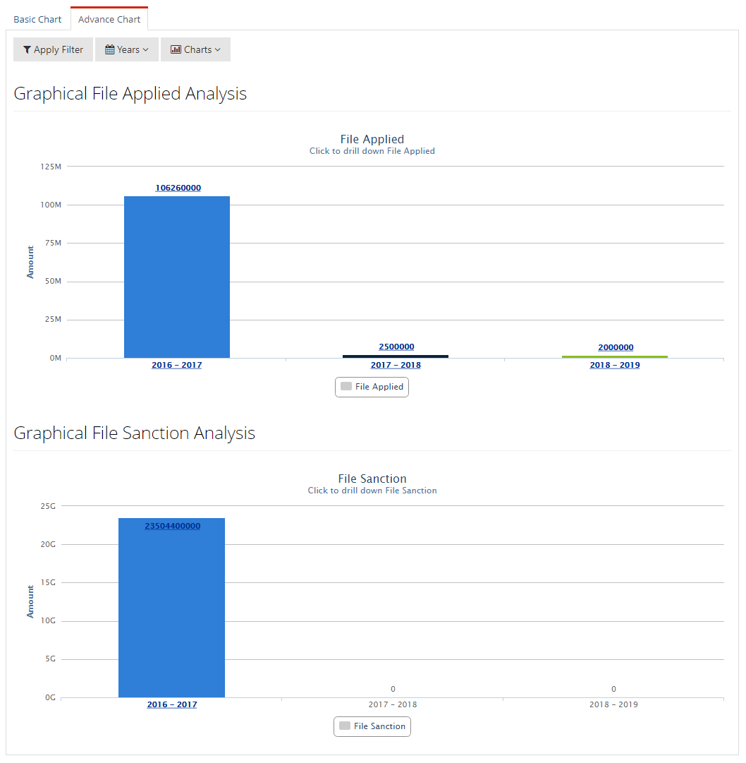 'Advance Chart' section helps user to search more specific information about the status of the files. The Graph section of the 'Advance Chart' displays the chart, of files which are in a loan process and the files which have been sanctioned. Graph displays records yearly, but user can be able to see the records quarterly by clicking on the Graph. It has three tabs in the top left corner namely Apply Filter, Years, Charts