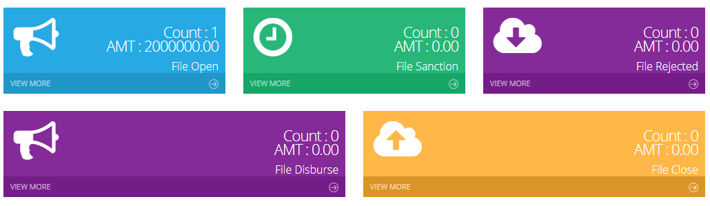 - File Open: The File Open card displays the total number of files which are in the loan process and the total amount of these files. By clicking on the View More button it will trigger user to the File Open List section.