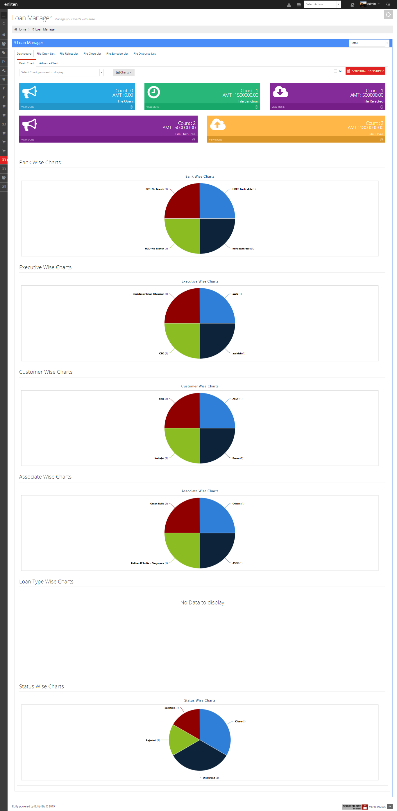 The dashboard gives the summary of the loan process. It is further classified into two parts, namely Basic Chart and Advance Chart.