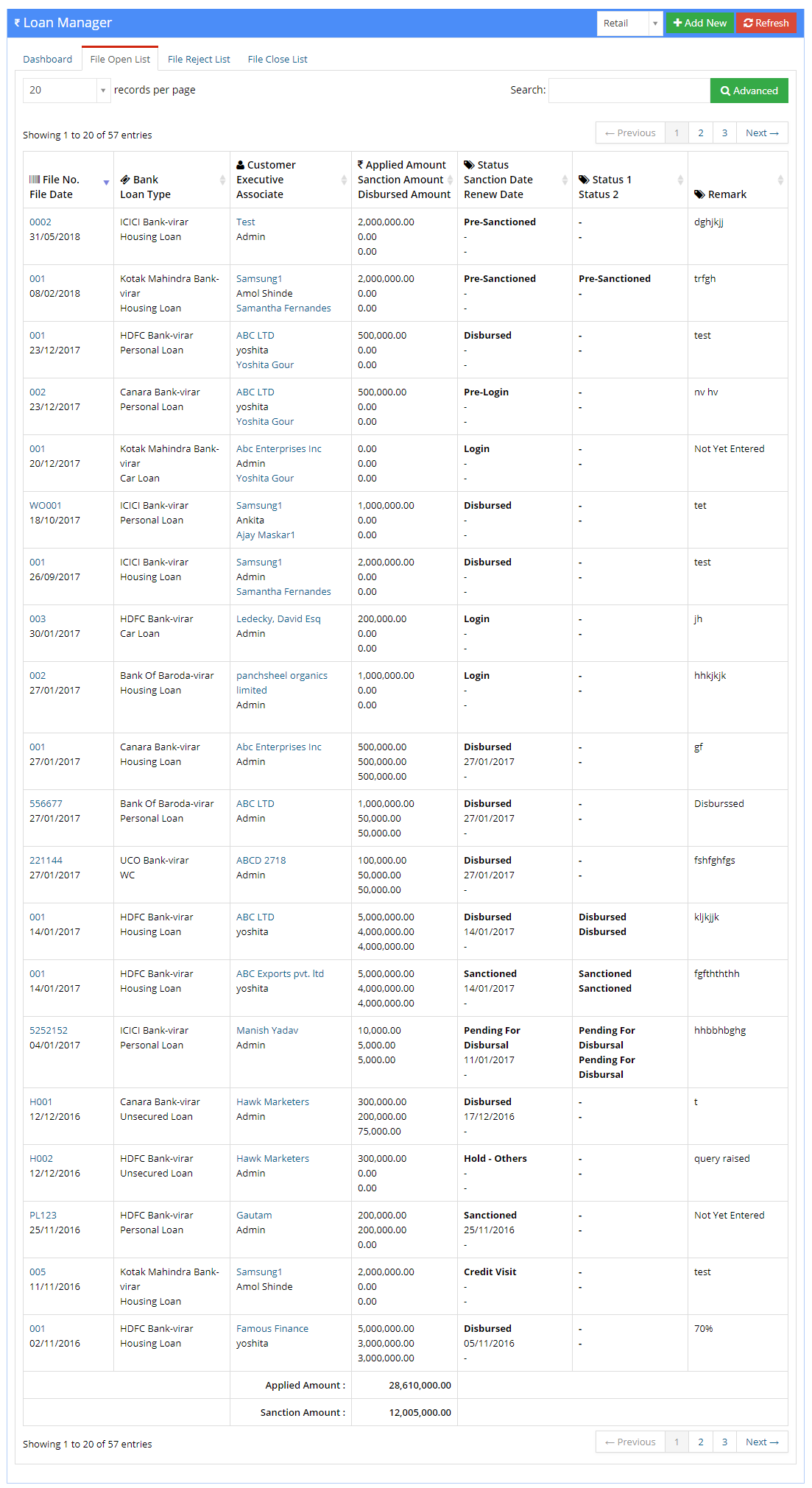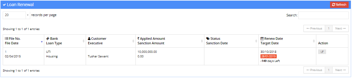 - Status, Sanction Date, and Renew Date: This column display the current Status of the file, Sanctioned Date, and Renew date.