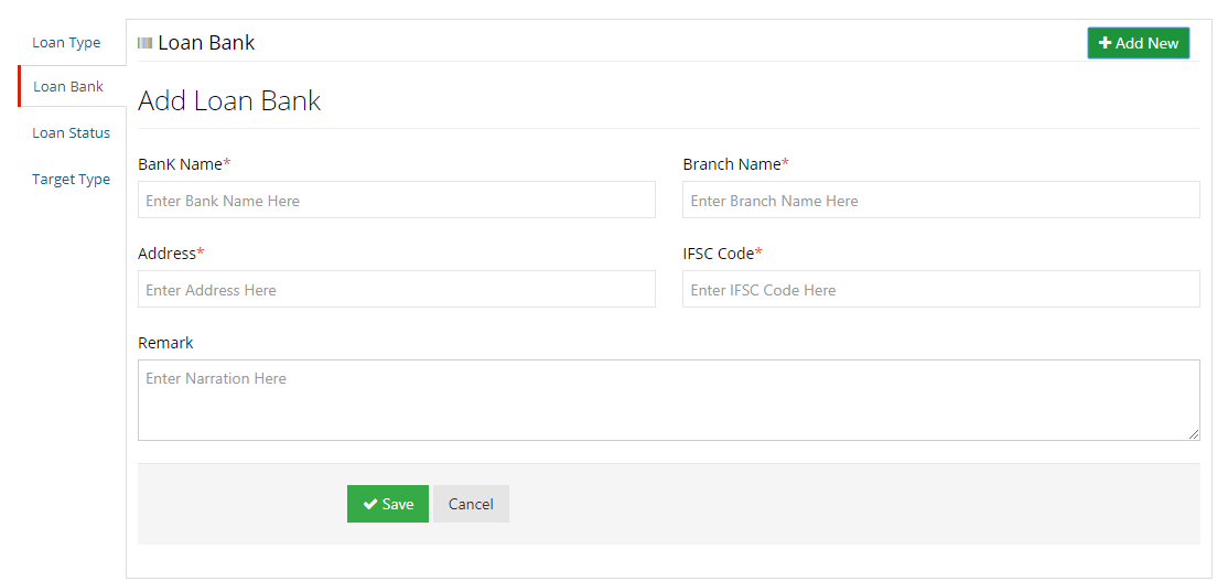 In Loan Bank section user can set the bank details. User can add details through the Add New button given in the top right corner of this section. The Add New tab comprises following fields.