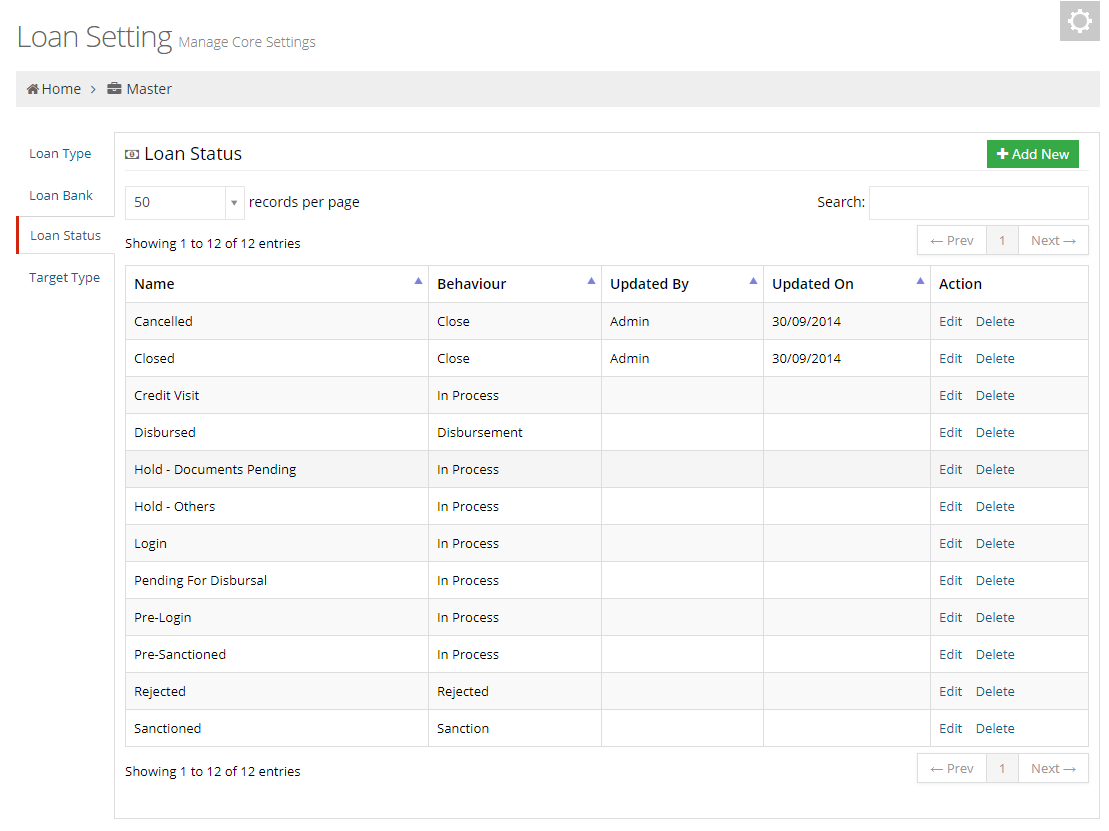 In Loan Status section user can set the status of the loan files.Through the Add New button given in the top right corner of this section user can add status. The table of settings consists of five columns which are as follows: