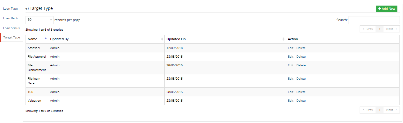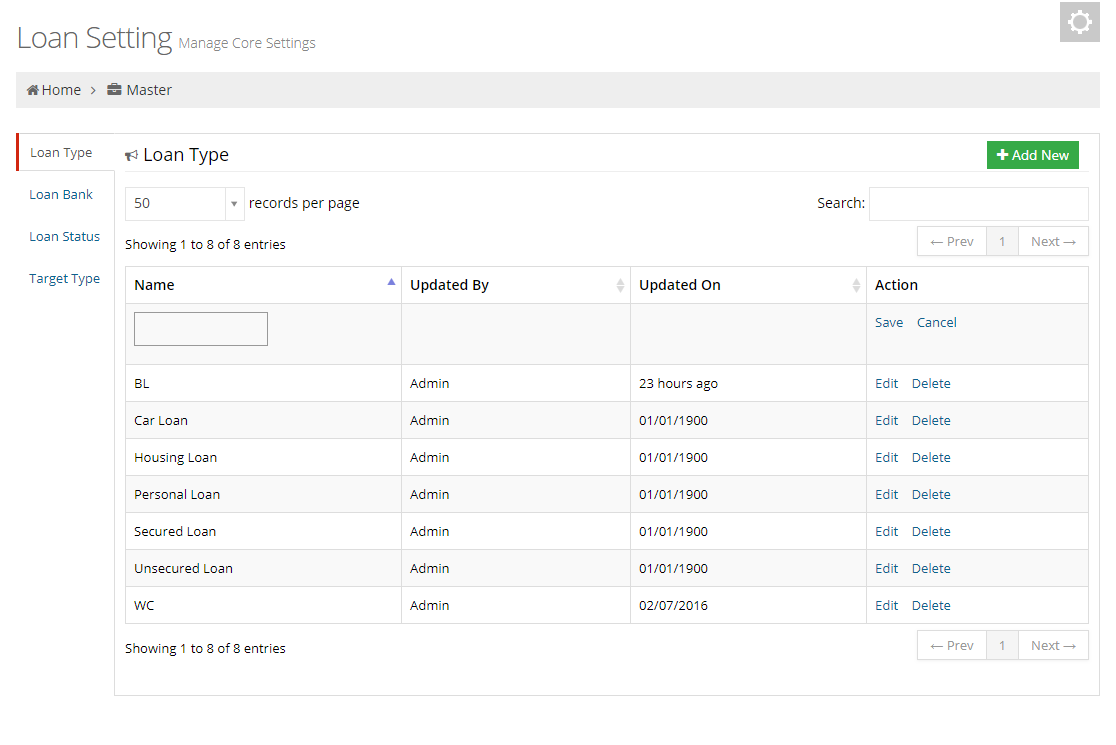 In a 'Loan Type' section user can set loan types. User can add details through the Add New button given in the top right corner of this section. The table of settings contain four columns as follow: